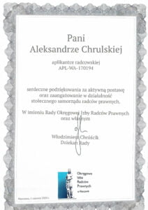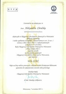 Po studiach odbywałam aplikację radcowską przy Okręgowej Izbie Radców Prawnych w Warszawie. Następnie po złożeniu egzaminu radcowskiego z wynikiem pozytywnym, zostałam wpisana na listę radców prawnych przy Okręgowej Izbie Radców Prawnych w Warszawie.