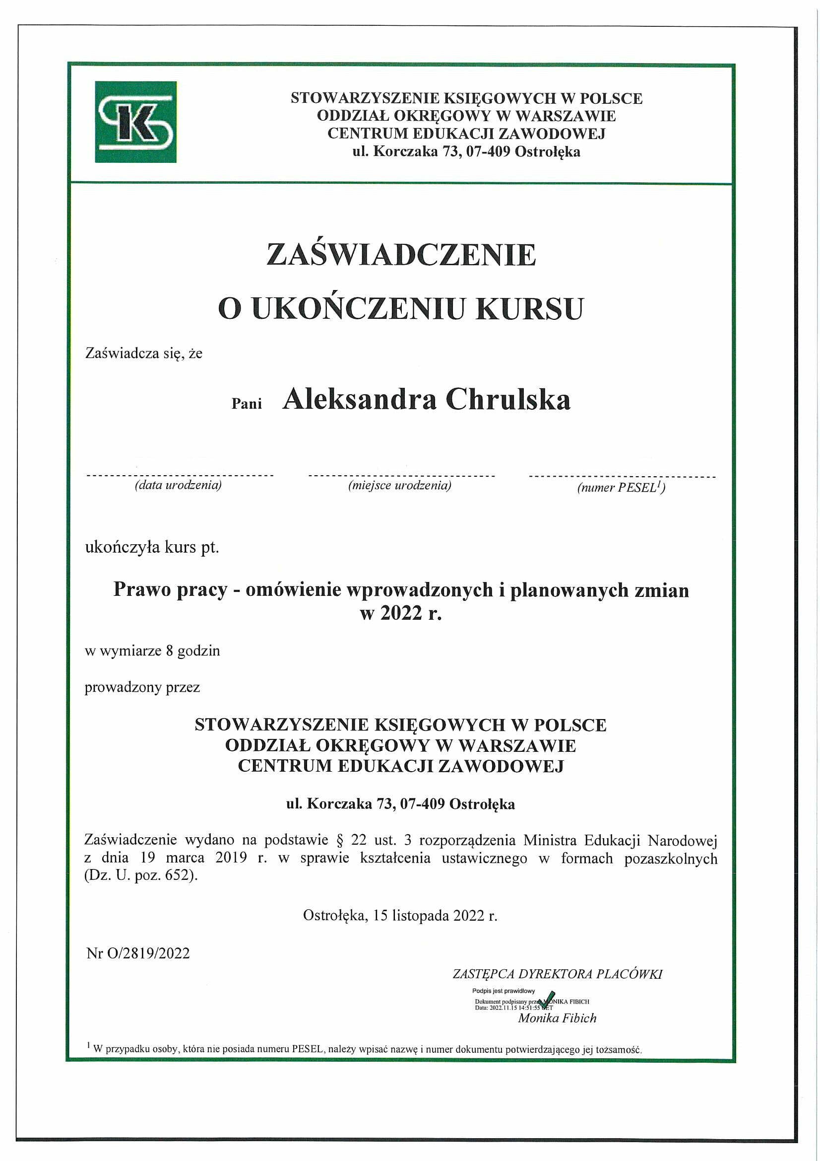 W międzyczasie odbywania aplikacji radcowskiej ukończyłam ponadto studia podyplomowe na kierunku: Prawo Pracy na Wydziale Prawa i Administracji Uniwersytetu Warszawskiego, studia podyplomowe na kierunku: Prawo lotnicze na Wydziale Prawa i Administracji Uczelni Łazarskiego w Warszawie oraz studia podyplomowe na kierunku: Prawo umów w obrocie konsumenckim i profesjonalnym na Wydziale Prawa i Administracji Uniwersytetu Jagiellońskiego w Krakowie.