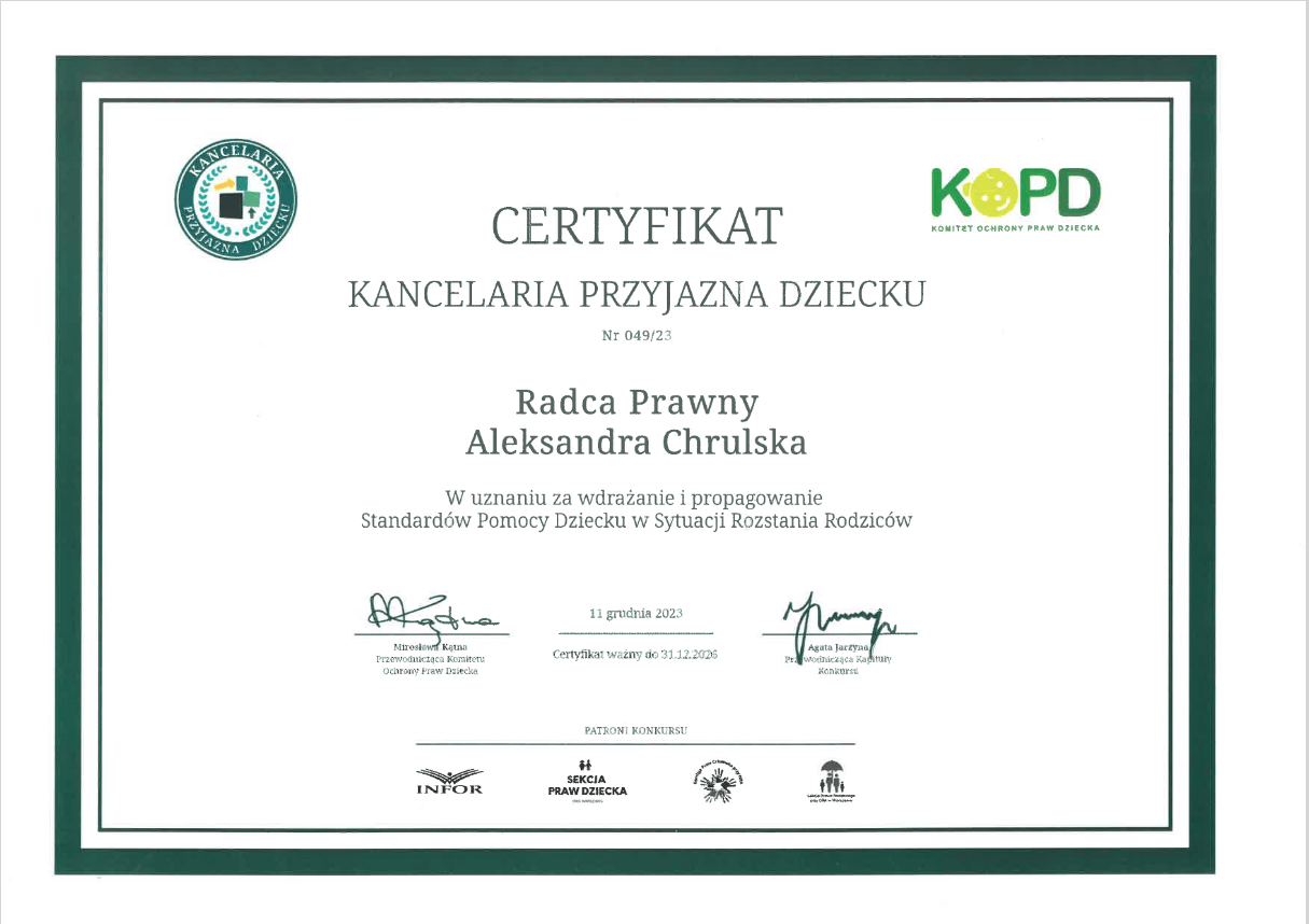 Z zamiłowania zajmuję się także prowadzeniem spraw z zakresu prawa rodzinnego, w tym zwłaszcza spraw o alimenty, władzę rodzicielską, opiekę.